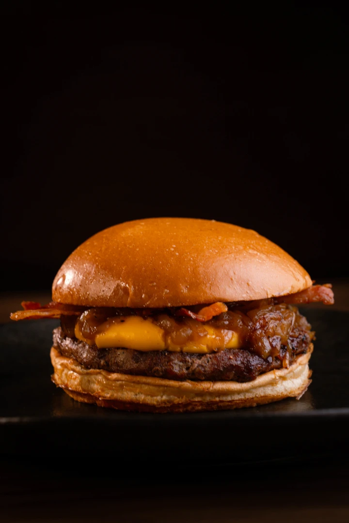 Pão brioche selado na manteiga, burger de 160g (in natura) grelhado no fogo, molho de queijo cheddar, cebola caramelizada e bacon crocante.